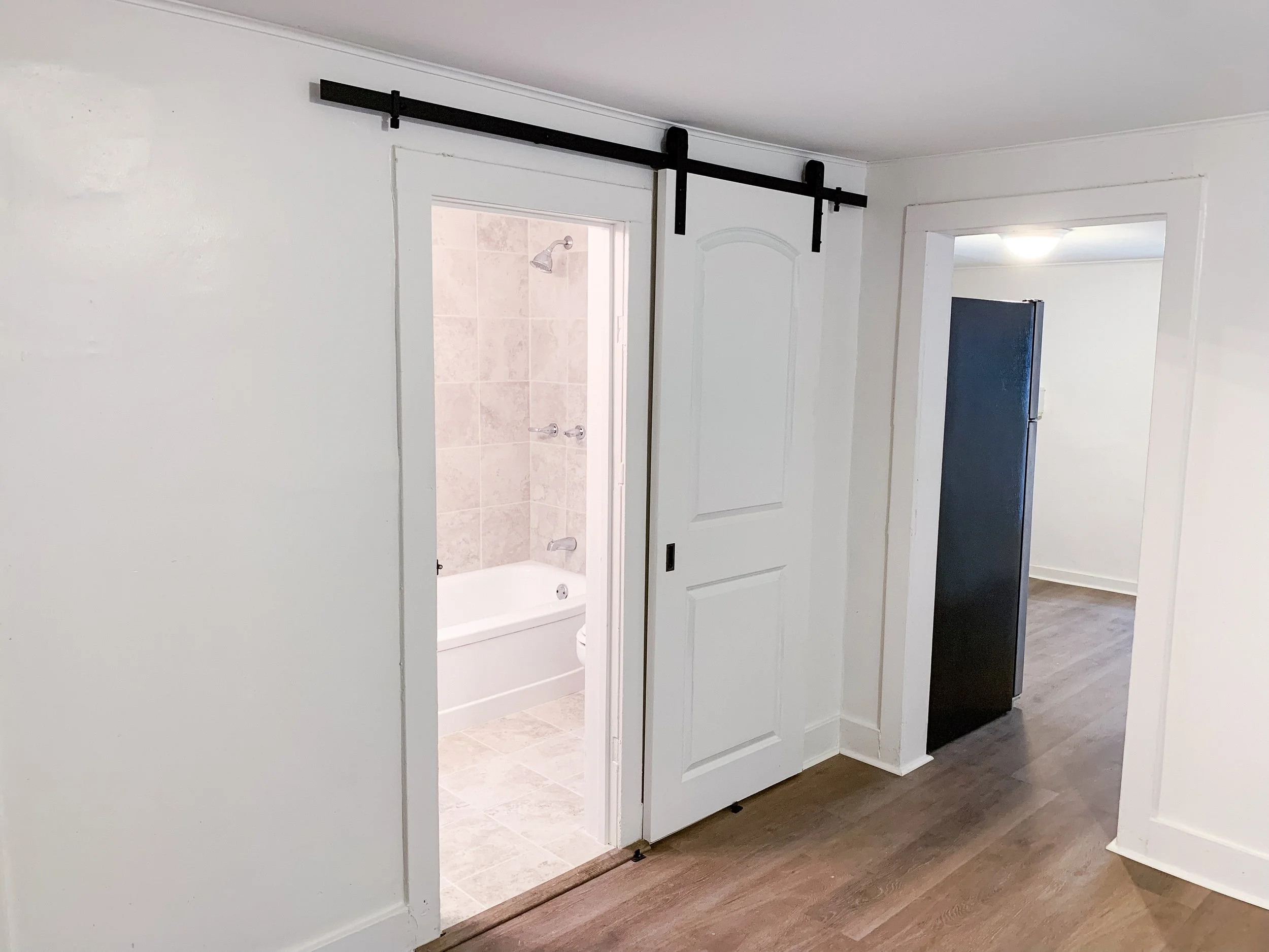Interior view of a room with a sliding barn door leading to a bathroom with tiled walls and a bathtub. Adjacent to the bathroom is an open doorway to another room with a dark refrigerator visible and wood flooring.