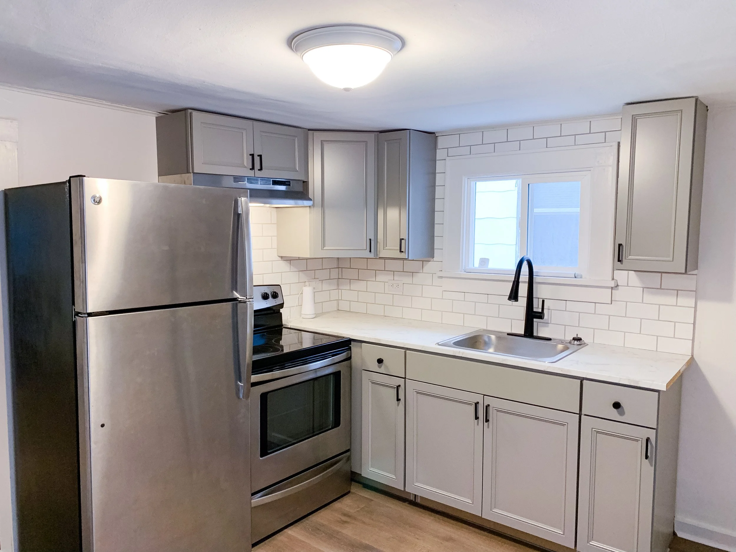 Modern kitchen with stainless steel fridge, stove, gray cabinets, white subway tile backsplash, and a black faucet.
