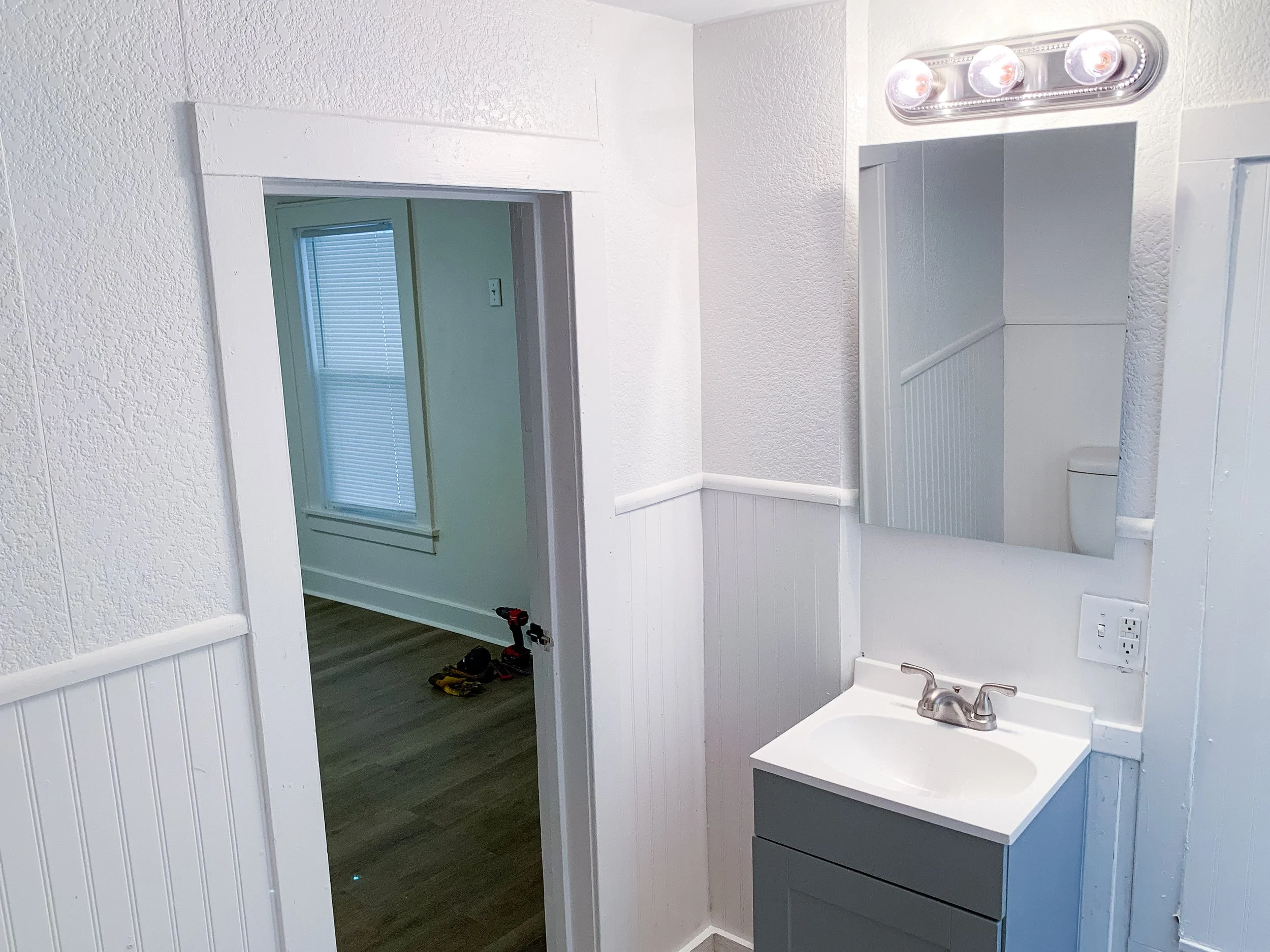 Small bathroom with a white sink and mirror, light fixture above the mirror, wainscoting on walls, and partially visible adjacent room with a window and tools on the floor.