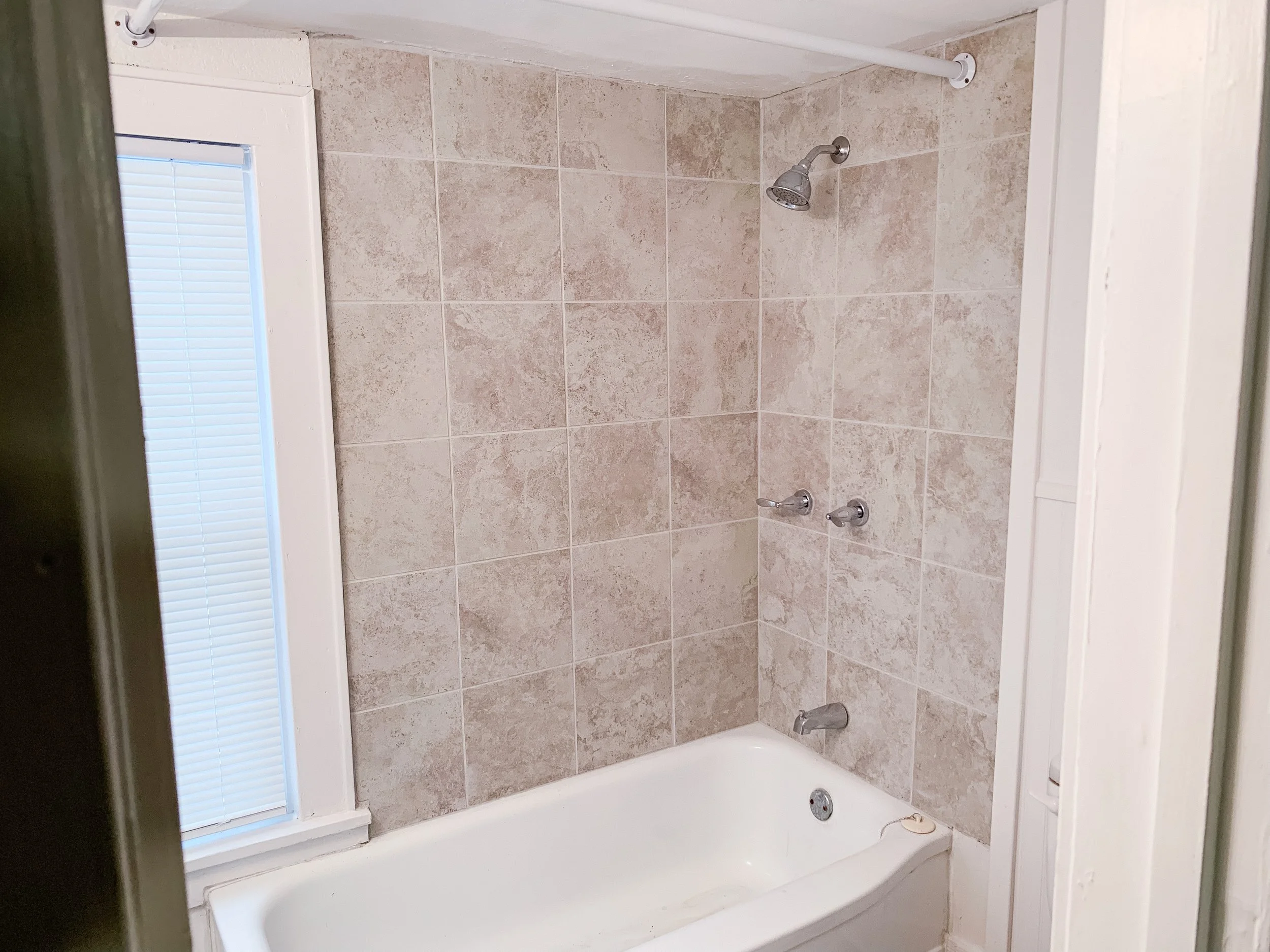 Bathroom with a white bathtub, beige tiled walls, a metal showerhead, faucet, and a window with blinds.
