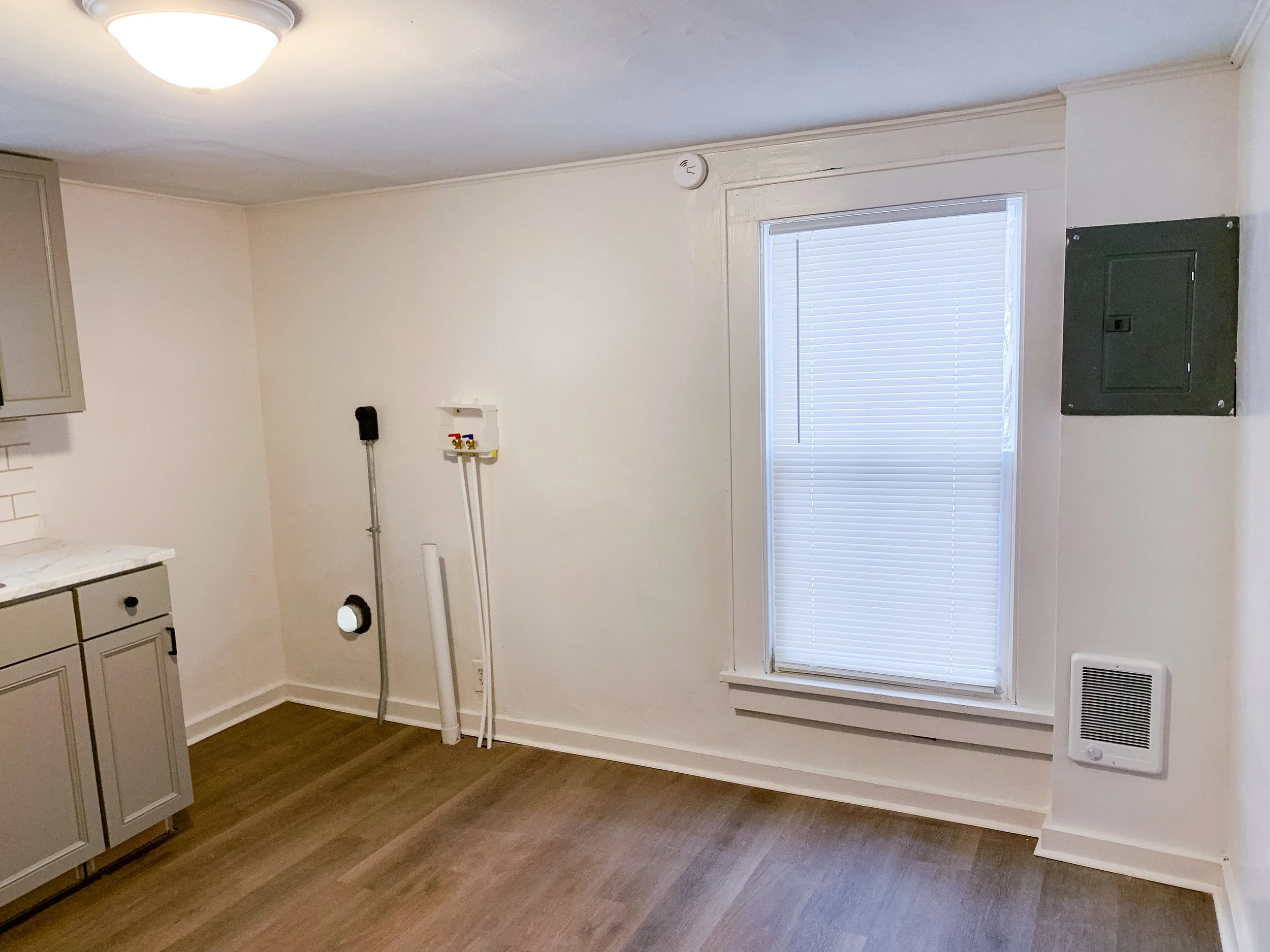 Interior of a room with a gray cabinet, light fixture, window with blinds, plumbing connections, and an electrical panel on the wall.